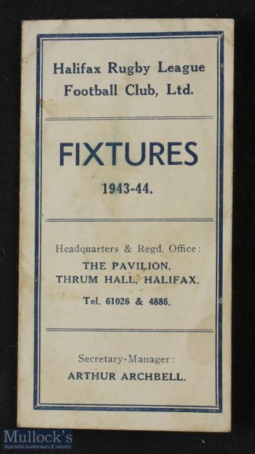1943/44 War time Halifax rugby league fixture list: small pocket sized 4-page card by Fawcett, Greenwood; fair