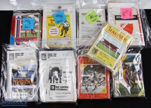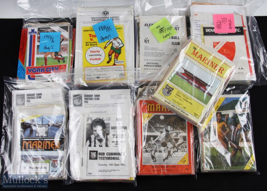 Grimsby Town home match programme collection to include 1981/82 Div. 2 homes complete season (21) + Shrewsbury Town 12 December 1981 (postponed), Watford (FLC), Rotherham Utd 26 December 1981 (postponed), Shrewsbury Town (Group Cup s/f), Wimbledon (Group Cup final), 1981/82 aways complete season (21) + Barnsley 28 December 1981 (postponed), Watford (FLC), Millwall (FAC), QPR (FAC), Newcastle Utd (FAC), Newport County (Group Cup), Doncaster Rovers (Group Cup), Scunthorpe Utd (friendly), Lincoln City (Lincs Snr Cup) plus Rugby League/Baseball (other sports at Blundell Park May 1982) Nottingham Forest (testimonial); 1982/83 Div. 2 homes complete season (21) + Scunthorpe Utd (FAC), + Sheffield Utd (Milk Cup) + Scunthorpe Utd (Milk Cup), + Lincoln City (Lincs. Snr. Cup); 1982/83 aways complete season (21) + Scunthorpe Utd (FAC), + Ipswich Town (FAC) + Scunthorpe Utd (Milk Cup), + Sheffield Utd (Milk Cup) + Lincoln City (FL Trophy) + Sheffield Utd (FL Trophy) + Heanor Town (friendly) + Denaby Town (friendly); 1983/84 Div. 2 homes complete season (21) + some duplicates, + Notts. County (friendly) + Norwich City (friendly) + York City (Milk Cup) + Coventry City (Milk Cup), 1983/84 aways complete season (21) + Portsmouth (FAC) + Coventry City (Milk Cup) + York City (Milk Cup) + Boston Utd (Lincs. Snr. Cup s/f) + Alfreton Town (friendly) 1984/85 Div. 2 homes complete season (21) + Notts. County (FAC), Watford (FAC) + Barnsley (Milk Cup) + Rotherham Utd (Milk Cup) + Norwich City (Milk Cup) + Sheffield Wednesday, + WBA (benefit) + Southampton (testimonial) 1984/85 aways complete season (21) + Notts. County (FAC) + Barnsley (Milk Cup) + Rotherham Utd (Milk Cup) + Everton (Milk Cup) + friendlies Scunthorpe Utd, Top Ten XI (at King George XI stadium), 1985/86 Div. 2, homes complete season (21) + Arsenal (FAC), York City (Milk Cup), Ipswich Town (Milk Cup) + Scunthorpe Utd (Lincs. Snr. Cup); 1985/86 aways complete season (21) + York City (Milk Cup) + Sunderland (FMC) + Immingham Town (friendly); o/all generally good (1 box qty)