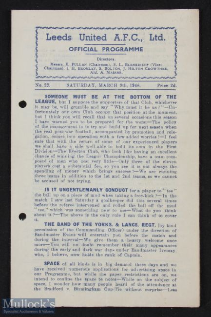 War time Leeds Utd v Grimsby Town war league match programme, 4 pager 9 March 1946; neat punch holes, o/wise good.