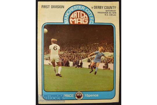 1976/77 Manchester City v Derby County Div. 1 match programme; 4 December 1976 famous for the advert on page 10 Anarchy in the UK tour by the Sex Pistols; the 1st gig took place at Leeds Polytechnic on Monday 6 December (the others were cancelled); the group created a new mode of rock & roll that changed the direction of the music industry to allow cultural differences at the time. Good.