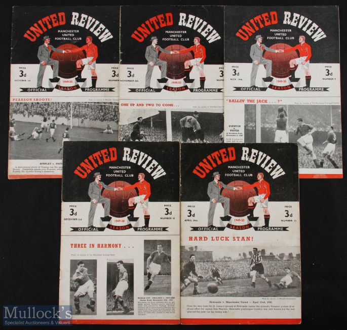 1949/1950 Manchester Utd Div. 1 home match programmes Sunderland, Huddersfield Town, Middlesbrough, Newcastle Utd, Fulham; fair. (5)