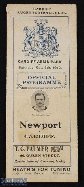 Very Rare 1912 Cardiff v Newport Rugby Programme: Great find, early clash between these two huge rival clubs, Oct 1912 at the Arms Park, attractive tall eight-panelled foldout style, well-illustrated, and with teams, pics, gossip, poems, fixtures and adverts. VG, esp for age