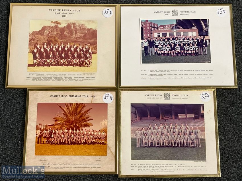Framed Cardiff RFC Teams inc Centenary Season (4): From the club via ex-Lion, Wales Cap & Team Manager Alan Phillips, in colour, 1969 team to S Africa, 1977 Centenary Tour to Canada & the USA, to Zimbabwe 1981 and the team of 1984-5. G/VG