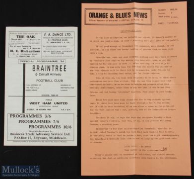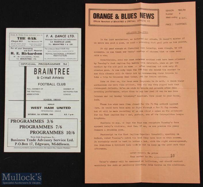 1968/69 Braintree & Crittall Athletic v West Ham United (Best, Holland, McDowell, Charles) Metropolitan league 5 October 1968 (plus official newsletter inside); team changes, o/wise good. (1)