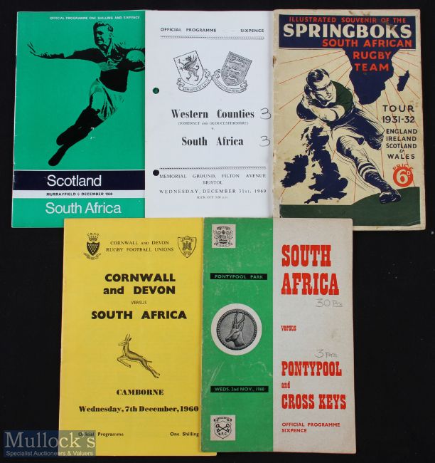 1931-1969 S Africa in the B Isles Rugby Programmes & Booklet (5): Great choice, the popular & very attractive 1931-2 Springboks' Illustrated Souvenir brochure, plus games in 1960 v Pontypool & Cross Keys & v Cornwall & Devon, and v Scotland and v Western Counties 1969. Booklet worn covers but lovely, others VG