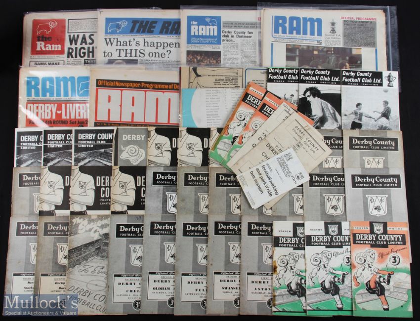Collection of Derby County home match programmes 1947/48 QPR (FAC), Chesterfield (FAC), 1948/49 Wolves, Cardiff City (FAC) (Sellotape to spine), Charlton Athletic, 1949/50 Northampton Town (FAC) (Sellotape to spine), Burnley, 1952/53 Aston Villa, Chelsea (FAC), 1953/54 Oldham Athletic, Fulham, 1954/55 Swansea Town, 1956/57 Rochdale, Stockport County, 1957/58 Barnsley, Fulham, Bristol Rovers, Blackburn Rovers, Huddersfield Town, Grimsby Town, Stoke City, Rotherham Utd, 1958/59 Barnsley, Charlton Athletic, Rotherham Utd, Brighton, 1959/60 Bristol Rovers, 1962/63 Huddersfield Town, Walsall, Rotherham Utd, 1963/64 Plymouth Argyle, Swindon Town, Bury, 1965/66 Reading (FLC), 1967/68 Hartlepools Utd (FLC), Birmingham City (FLC), Bristol City, 1969/70 Crystal Palace (FLC replay), Manchester Utd (FLC), Preston NE (FAC), 1970/71 Millwall (FLC), plus 1970/71 Fixture List/with park'n'ride system explained; Newspaper style issues 1971/72 Notts. County (FAC), WBA, Stoke City (Texaco), Arsenal (FAC), Shrewsbury Town (FAC), Leeds Utd (FLC), 1972/73 Tottenham Hotspur (FAC), QPR (FAC), Leeds Utd (FAC), Chelsea, 1973/74 Norwich City/Sunderland (FLC (double issue), Coventry City (FAC), QPR, 1974/75 Leeds Utd (FAC), Orient (FAC), 1975/76 Liverpool (FAC), Aston Villa, Newcastle Utd (FAC), 1976/77 Coventry City (2 January 1977-postponed), 1979/80* Roda Kerkrade (friendly) plus team sheet insert) (* the last newspaper programme!) 1979/80 WBA (standard size programme); fair. (63)