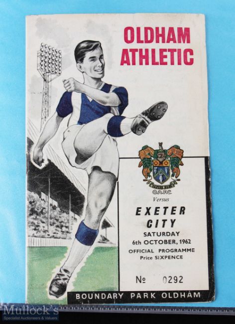 1962/63 Oldham Athletic home programmes collection (missing Lincoln City, Rochdale, Darlington) including Oxford Utd, Southport (record 11-0 victory in the snow), Bradford City (FA cup), Notts. County (friendly), Tranmere Rovers (postponed 22 December), Brentford (2 versions), Hartlepools Utd (2 versions), in a binder; fair/good. (a lot)