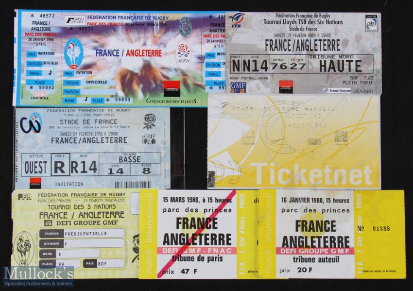France v England Rugby Tickets (7): At Paris in 1986, 88, 92, 96, 98 & 2000, plus August 2007 at Marseilles (RWC warm-up, fading). O'wise VG
