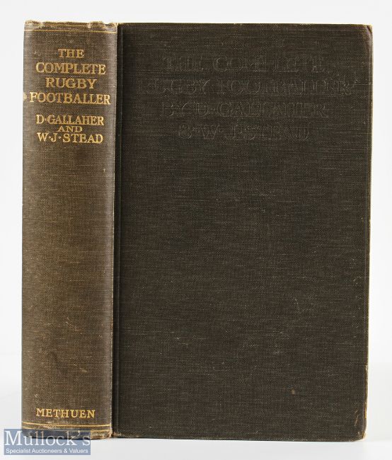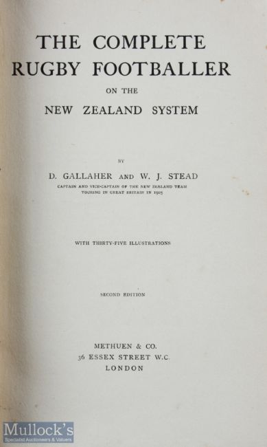 Famous Scarce Early Rugby Book, 1905 All Blacks: The classic 1906 volume (2nd edition), The Complete Rugby Footballer by Gallaher & Stead. Hard bound, 322pp with gilt titles, spine extremities worn, a little foxing but overall G/VG for it's more than 115 years of age, plates intact. A very presentable copy of a must-have work
