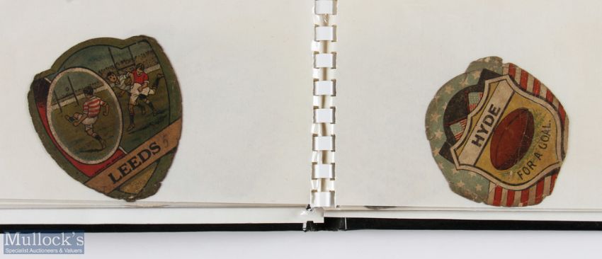 Vintage Baines etc Cards Collection (17): The very old, 120-130 years, flimsy and often colourful paper shield shaped 'cards' by Baines and by Sharpe of Bradford. Clubs included in the small plastic-sleeved album are Rockcliffe, Roove, Wortley, Tramwell, Royal High School, North West Manchester, Cambridge (2), Runcorn (2 different), Leeds (2 different), Hyde, Kendal, Ulverston, Broughton & Enniscorthy. Mixed conditions, some G, some fair, a few poor, hence guides….