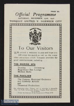 1946/47 Torquay Utd v Norwich City Div. 3 (S) programme 23 November 1946, fold out type; good. (1)