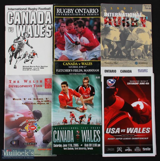 1994/97/2000/05 Wales Rugby Programmes in North America (6): v Canada at Hamilton and at Markham, 1994; same venues for Ontario & Canada games issue 1997, with scarce Ontario teams insert; Canada A v Wales A 2000; and v both Canada and the USA, Toronto & Hartford, 2005. Excellent