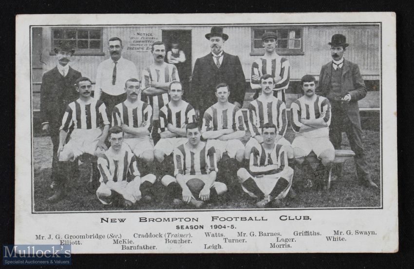 1904 Postcard featuring New Brompton FC team line-up, b&w, with players named; postally used & stamped 18 November 1904 with message to Mr Holman; good. (1) NB: New Brompton renamed Gillingham in 1912
