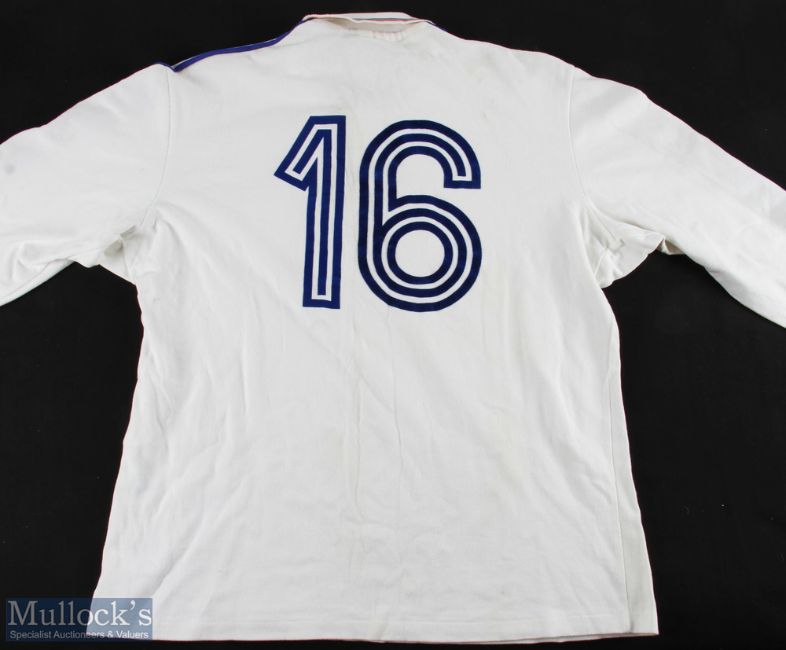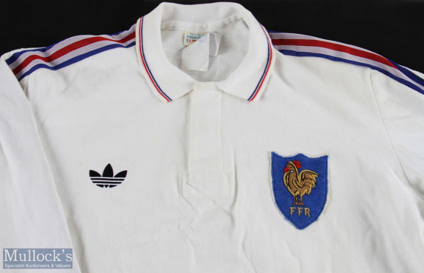 1988/9(?) French Rugby Jersey: Adidas XL white jersey with blue & red stripes to sleeves and collar, stylised blue & white no.16 stitched to rear, adidas logo & blue FFR shield with red & gold cockerel badge to breast. Sub's jersey (not worn by him) donated to the major collector & vendor, by Philippe Dintrans, the 50 times-capped French hooker & captain. Excellent, very desirable