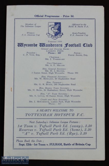 1951/52 Wycombe Wanderers v Tottenham Hotspur friendly match programme 1st September 1951; fair/good. (1)