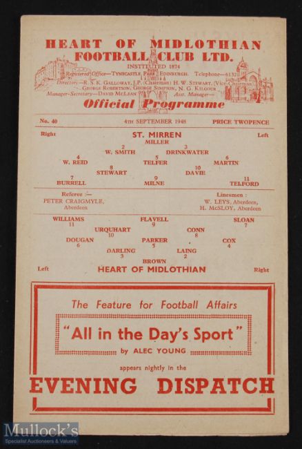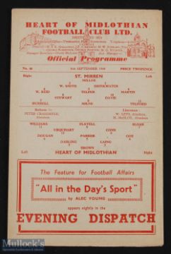 1948/49 Hearts v St Mirren Div 'A' match programme 4 September 1948, fold out type; good. (1)