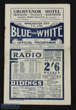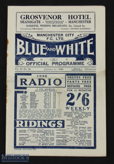 Pre-War 1935/1936 Manchester City v Grimsby Town Div. 1 match programme 1st January 1936; rusty staple, fair. (1)