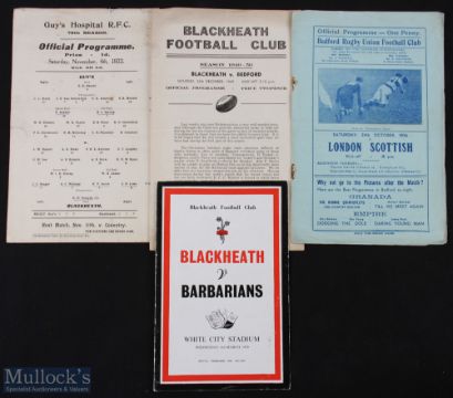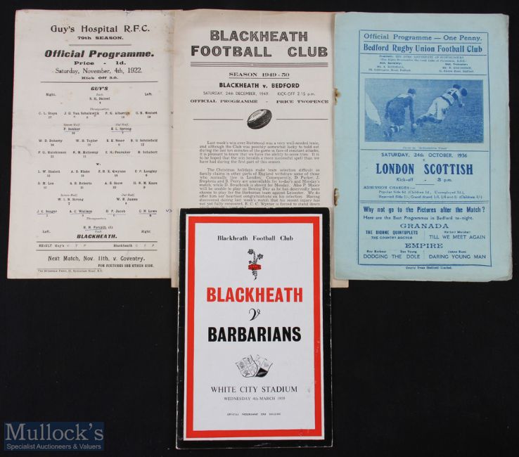 1922 on Mostly Blackheath Rugby programmes (4): At Guy's Hospital 1922, great names on both sides, large stiff card, very evocative; home v Bedford, Christmas Eve 1949 with the game filmed by BBC TV, a first for the Rectory Field; v the Barbarians at White City, Centenary, 1959; and Bedford v London Scottish, 1936. So collectable