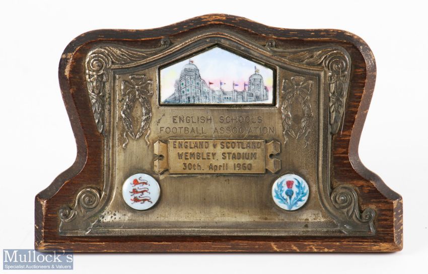 1960 England v Scotland School Boys International at Wembley, Trophy and programme, a good-looking trophy with a plated front with enamel England Scotland emblems and a view of Wembley - three of the schools went on to play fulltime football, with most notably Paul Madeley (Leeds and England)
