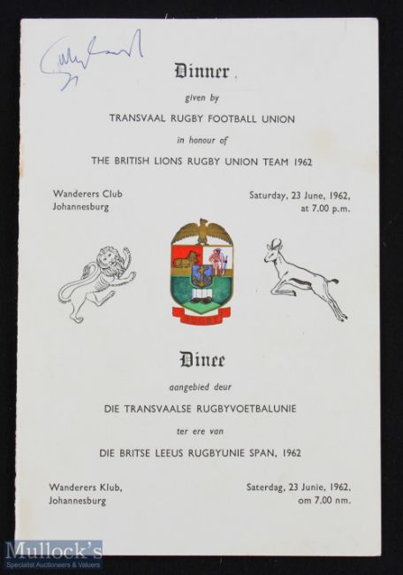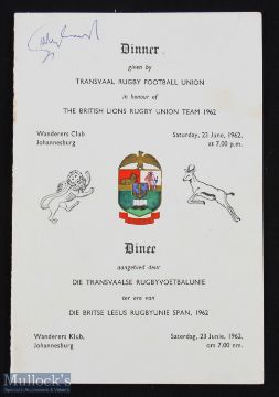 1962 British Lions v South Africa 1st Test Menu: 23rd June, first test: dinner menu signed by Jones, Pask, Meredith, Millar, Rollo, Hewitt, Campbell-Lamerton + 6 Springboks. Lovely memorabilia