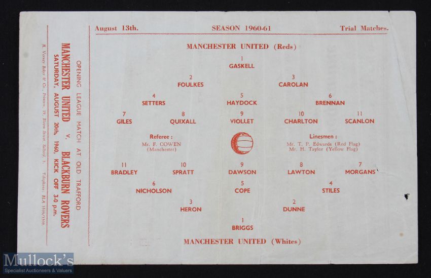 1960 Manchester United public practice matches Reds v Blues (junior match at 2pm), Reds v Whites (senior match at 3.30pm) 13 August 1960, single sheet, tiny perforation, no writing, fair. (1) NB: Final public practice matches at Old Trafford.