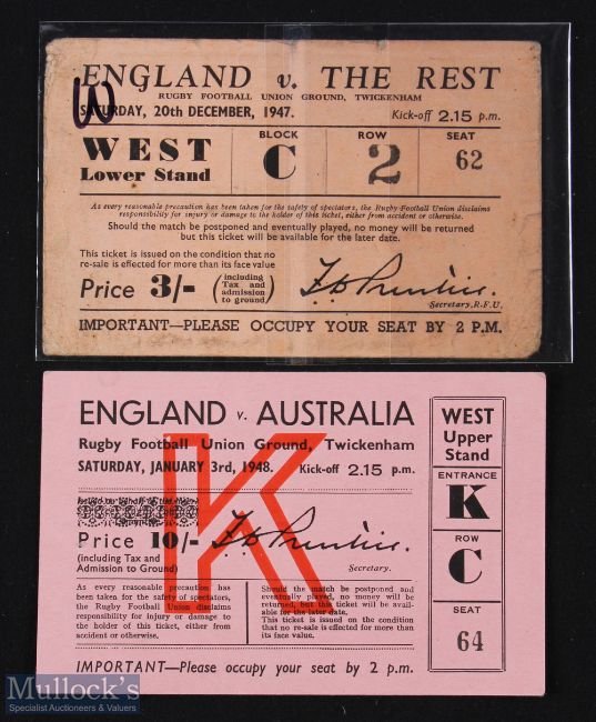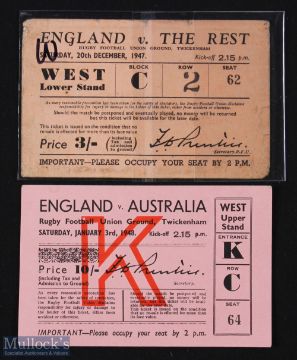1947-8 England v Australia & Trial Rugby Tickets (2): v the Wallabies in January 48 and the immediately previous trial, that one just a little worn, the other VG