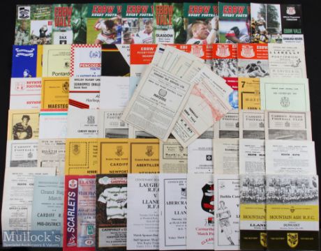 1951-2001 Welsh Club Rugby Programmes (65): Great selection across the decades. All in Wales except one, but often against cross border or channel opponents. 10 of the old 'Top 16' have homes here, and other smaller clubs, inc 6 early WRU Cup rounds, Centenary games European Cup etc, and a nice Cardiff group including that scarce Bective Rangers away and even scarcer Mid District XV at Pontypridd 1963. Well worth it, gen G/VG
