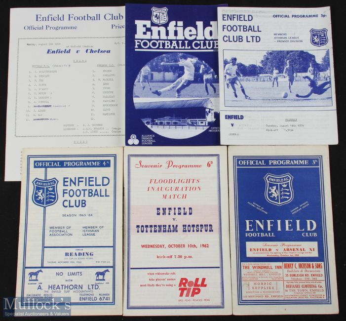 Non-League Enfield FC home programmes 1958/59 Arsenal (opening of stadium bar lounge), 1962/63 Tottenham Hotspur (floodlights opening), 1963/64 Reading (FAC), 1968/69 Chelsea (friendly) single sheet, 1979/80 Arsenal (friendly), 1983/84 Arsenal (friendly); fair/good. (6)
