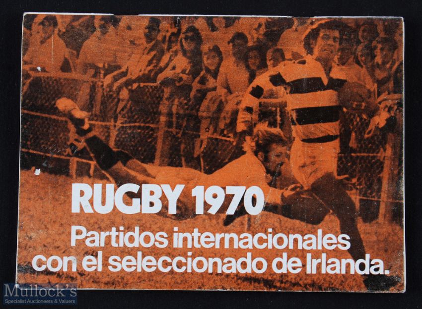 Rare 1970 Argentina v Ireland Rugby Programme: Recently very sought-after, with orange landscape-shaped pictorial cover, packed 76pp second test issue from the 6-3 Pumas' win, much cleaner than the previous week. Clipped review enclosed. VG for vintage