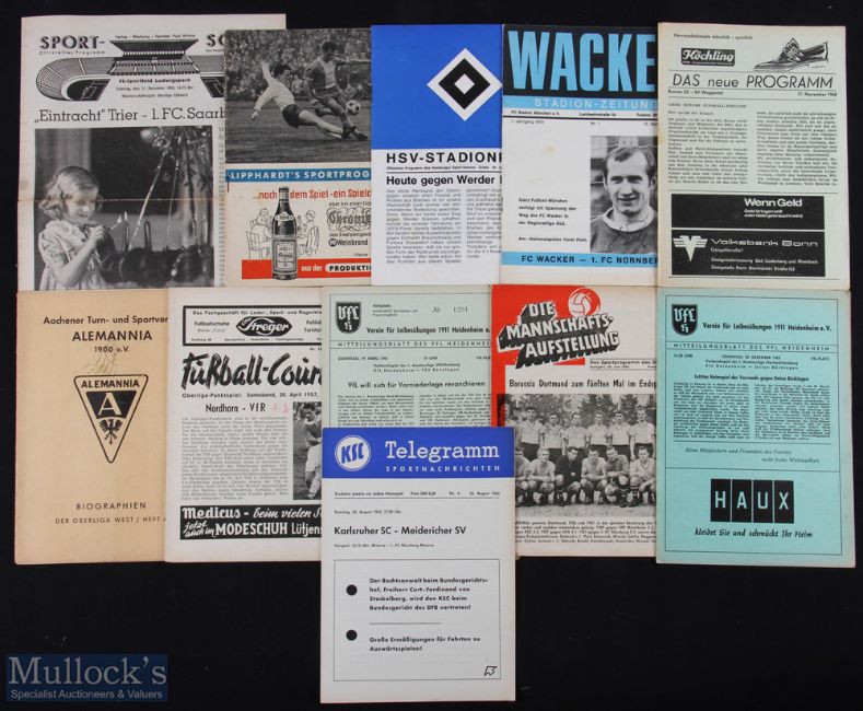 Selection of German club programme issues to include 1950 Alemannia Aachen 50 years celebration handbook issue (player photos etc.), 1955/56 Eintracht Trier v FC Saarbrucken, 1956/57 Eintract Nordhorn v VFR Neumunster, 1960/61 VfL Heidenheim v TSV Benningen, 1962/63 Borussia Dortmund v FC Koln (League play off final), 1963/64 Karlsruher SC v Meidericher SV, 1963/64 VfL Heidenheim v Union Bockingen, 1968/69 Bonner SC v SV Wuppertal, 1970/71 FC Wacker Munich v FC Nurnberg, 1975/76 Hamburg SV v Werder Bremen, 1965 Lipphardt's programme 17 April covering Bundesliga (North) v Regionalliga (North), Victoria v VfB Lubeck, Bremerhaven 93 v SV Friedrichsort; fair/good. (11)