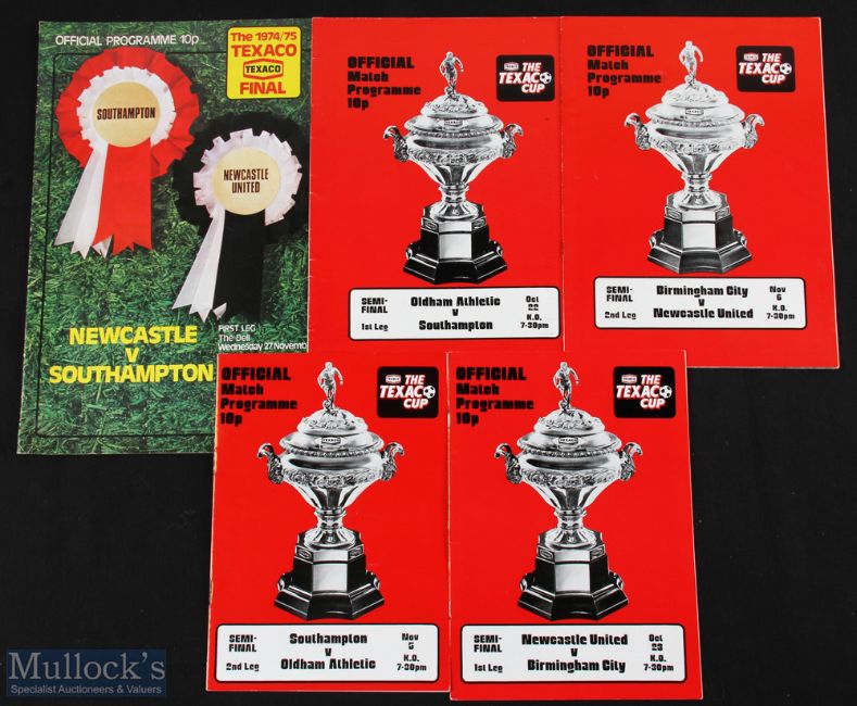 1974/75 Texaco competition programmes Newcastle Utd v Birmingham City (s/f), Birmingham City v Newcastle Utd. (s/f), Oldham Athletic v Southampton (s/f), Southampton v Oldham Athletic (s/f), Newcastle Utd v Southampton (final); good. (5)
