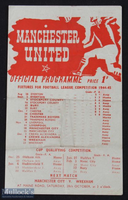 1944/1945 Manchester United v Tranmere Rovers War League North match programme 21 October 1944; single sheet, team changes, fair. (1)