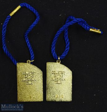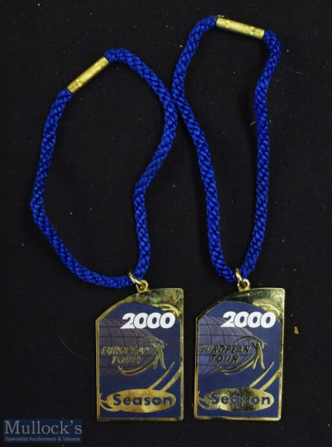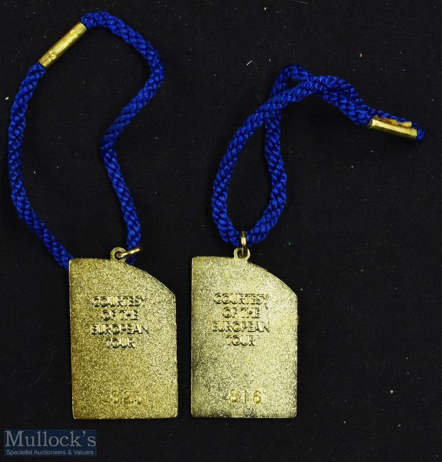 2000 European Golf Tour gilt and enamel members season badges (2) - each embossed on the reverse 'Courtesy of The European Tour' No 816 and the other No 823 both in the original packet