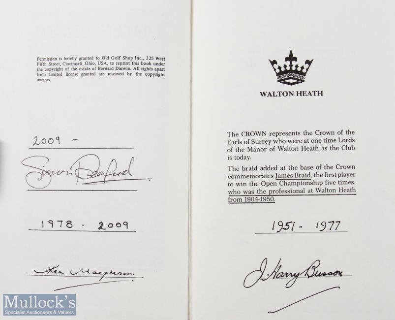 Rare 1981 Ryder Cup Walton Heath Presentation ltd ed copy Bernard Darwin "James Braid" Book and Club History (2) - full leather and gilt boards and spine embossed with The Ryder Cup logo to the front board - limited ed no.14/200 - permission granted by Old Golf Shop (USA) to reprint this book under copyright of the estate of Bernard Darwin - signed by 3x Walton Heath golf professionals to incl Harry Busson (1951-1977); Ken Macpherson (1978-2009) and Simon DePeaford (2009-) (VG). Plus a copy of History of Walton Heath Golf Club 1904-1979 compiled by Cyril Hewertson OBE - 54pp illustrated in the original wrappers (VG).