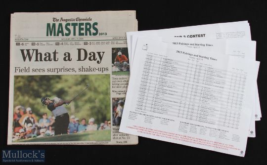 2013 Masters Golf Tournament collection of Pairings and Starting Times sheets and The Augusta Chronicle newspaper editions - won by Adam Scott - Pairings and Starting Times sheets to include Practice Round, Part 3 Contest, and all 4 days of the competition (some duplication); together with a copy of "the Augusta Chronicle to include "Masters" edition for the 3rd round (a lot)