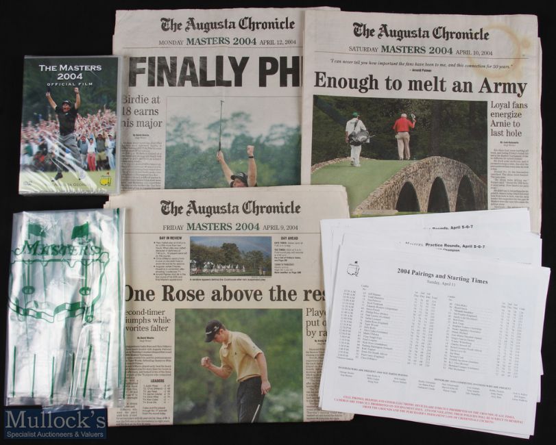 2004 Masters Golf Tournament Collection (5) to incl Masters 2004 Official DVD (unopened), Pairings and Starting Times sheets and 3x The Augusta Chronicle newspapers (a lot) - Pairings and Starting sheets include the practice rounds and the last 3 days of play (some duplication); and newspaper covering Friday, Saturday (Arnie's final appearance) and Monday edition following Phil Mickelson's first major in 46 outings