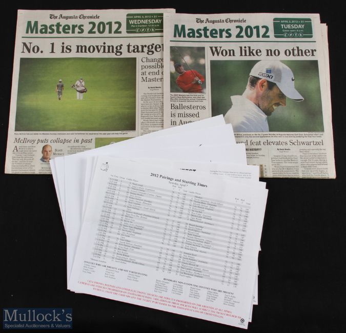 2012 Masters Golf Tournament collection of Pairings and Starting Times sheets and The Augusta Chronicle newspapers and (6) - won by Bubba Watson - Pairings and Starting Times sheets to include Practice Rounds, Par 3 Contest, and the 3rd day's play together with 2 copies of the Augusta Chronicle leading up to the start of the tournament