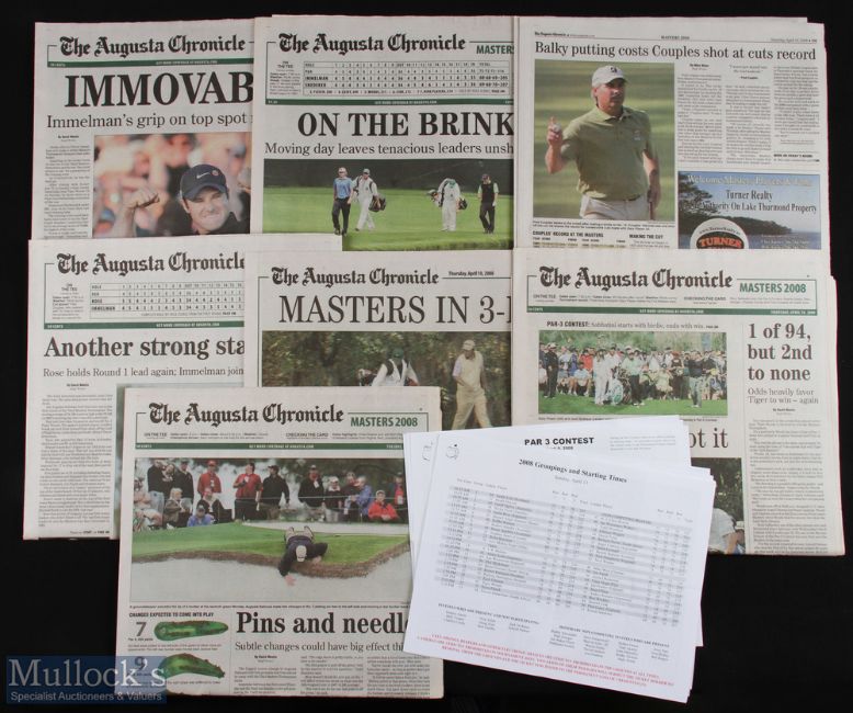 2008 Masters Golf Tournament collection of Pairings and Starting Times sheets and The Augusta Chronicle newspapers and (a lot) - won by Trevor Immelman - Pairings and Starting Times sheets to include Practice Round, Part 3 Contest, and all 4 days of the competition (some duplication); together with various newspaper editions including complete coverage of all 4 days and final summary on the Monday as well as an early Tuesday edition published on 8 April- c/w Masters carry bag (a lot)