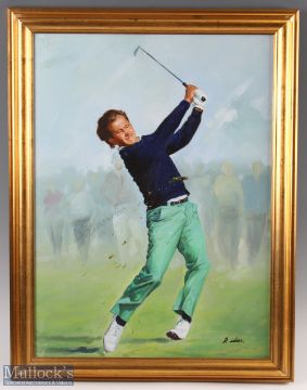 D Idrier (Contemporary) - Severiano Ballesteros Open Golf Champion Royal Lytham 1988 'In Full Cry' oil on board signed by both the artist and in full Seve Ballesteros - image 23" x 16.5" - overall 27 x 20.5" - Note the oil painting was copied from the famous Ballesteros Photograph taken during the 1988 Open Golf Championship by David Cannon and now in Getty Images