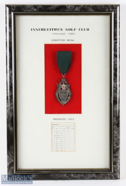 Rare, large and stunning 1893 Innerleithen Golf Club (Inst 1886) Silver Golf Medal c/w Green Ribbon - finely embossed c/w cross golf clubs, golf balls, Far & Sure banner, c/w central shield engraved "Presented by A. Robertson Esq - Won by - Wm. Hall" - medal and ribbon measures overall 5 7/8" mf&g c/w Scorecard - overall 18.75" x 12" From the late David Easby Estate