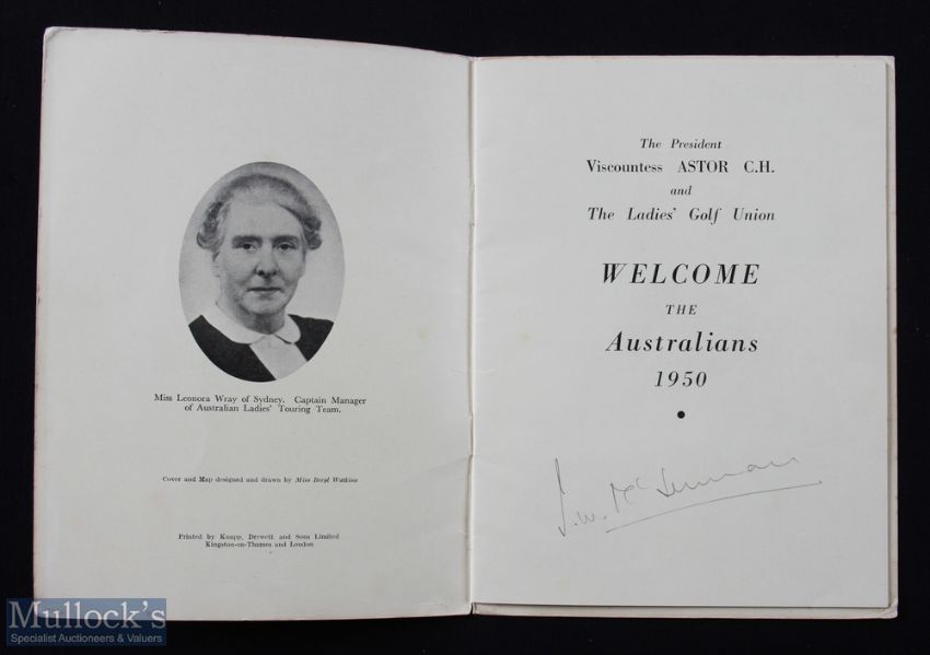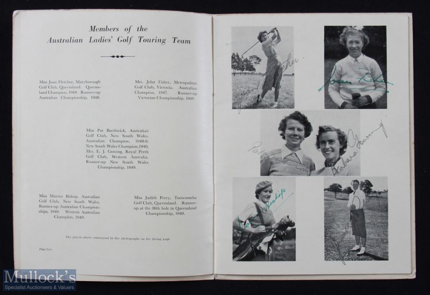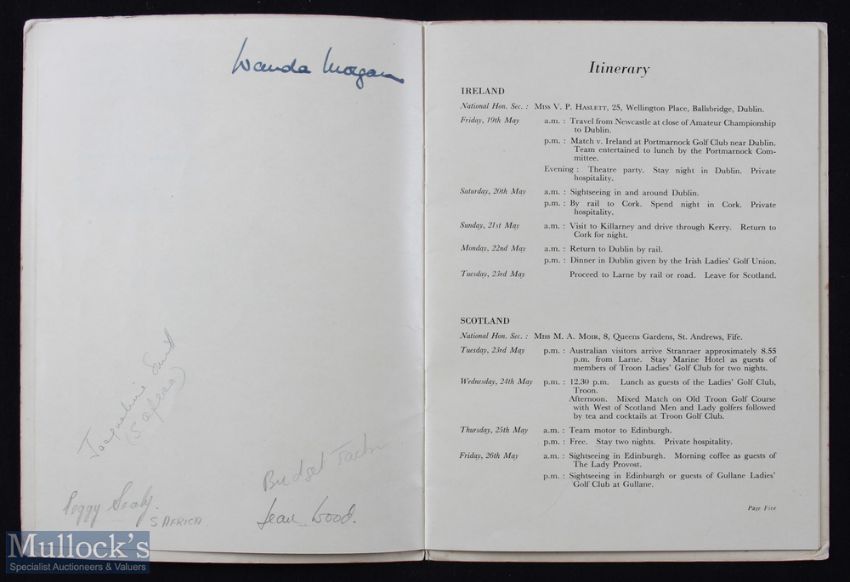 Interesting Collection of Ladies Golf Union Signed Tour Programme and Women's Monthly Golf Magazines from 1950s onwards (4) - namely 1950 LGU Golf Signed Itinerary/Programme for the visit of Australian Ladies Golf Touring Team - signed by all 6x members of the Australian team to their player pen photographs plus author signatures incl Wanda Morgan, 20pp - the visit included all the home nations starting in May in Ireland and finishing in London on Friday 7th July - full itinerary and schedule - with matches v Ireland (Portmarnock GC); v Scotland (St Andrews); v England (Little Aston); v Wales (Ashburnham GC) what a trip!! Plus 3x Fairway and Hazard Women's Golfing Monthly magazines to incl May 1960 & June 1960 (Curtis Cup Analysis and Match Report); and March 1971 front page featuring postal strike but a good article on Wanda Morgan and her achievements