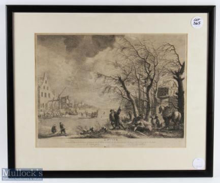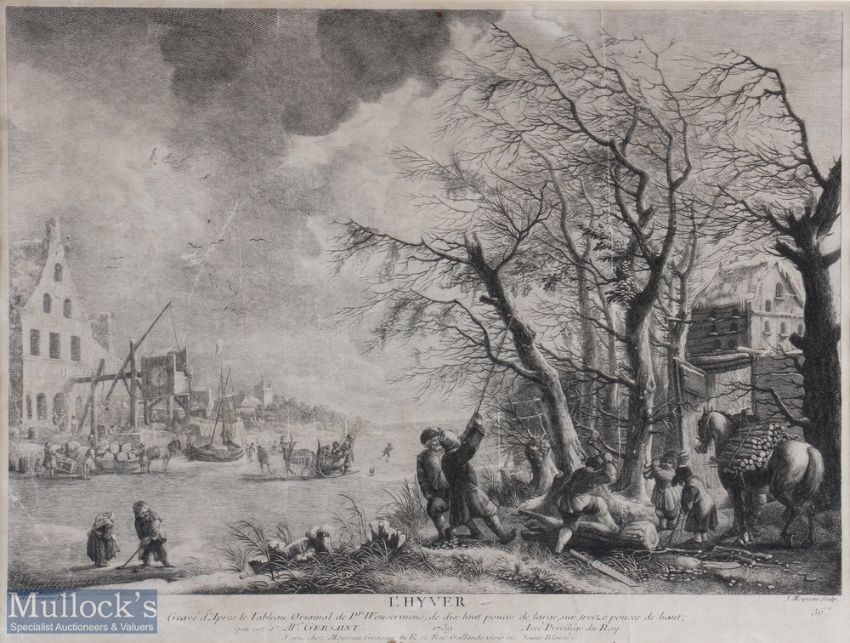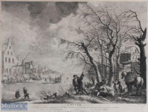 Early 18th c Dutch Kolf Winter River Scene Engraving by P Wouvermens dated 1739 and titled L'Hyver - image 13.75 x 18.25" From the late David Easby Estate