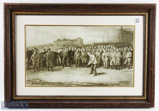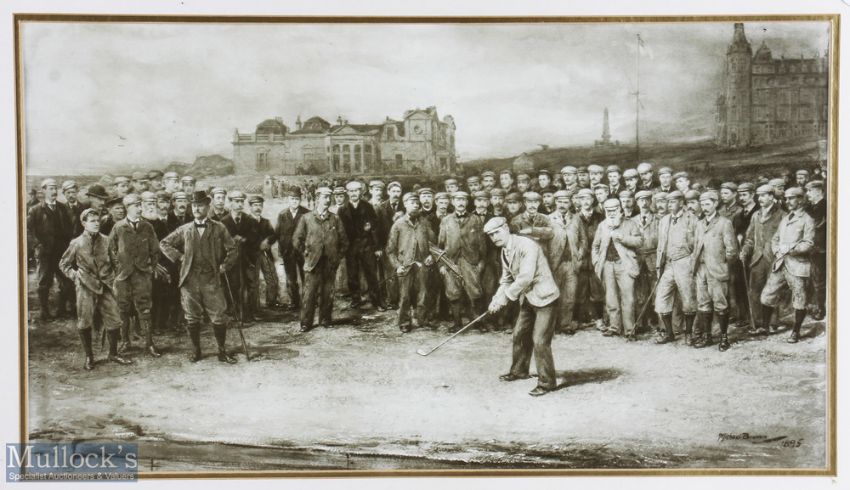 Michael J Brown (after) 1895 Open Golf Championship - J H Taylor (the winner) addressing the ball in front of Swilkin Burn and First green with large following of golfing personalities and players to incl Old Tom Morris, John Ball, Freddie Tait, Harold Hilton et al - image 12.5" x 22.25" - mf&g overall 21.75" x 31.5" From the late David Easby Estate