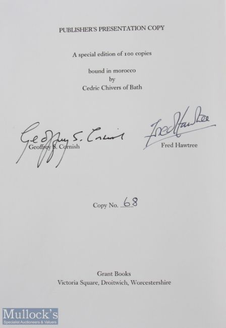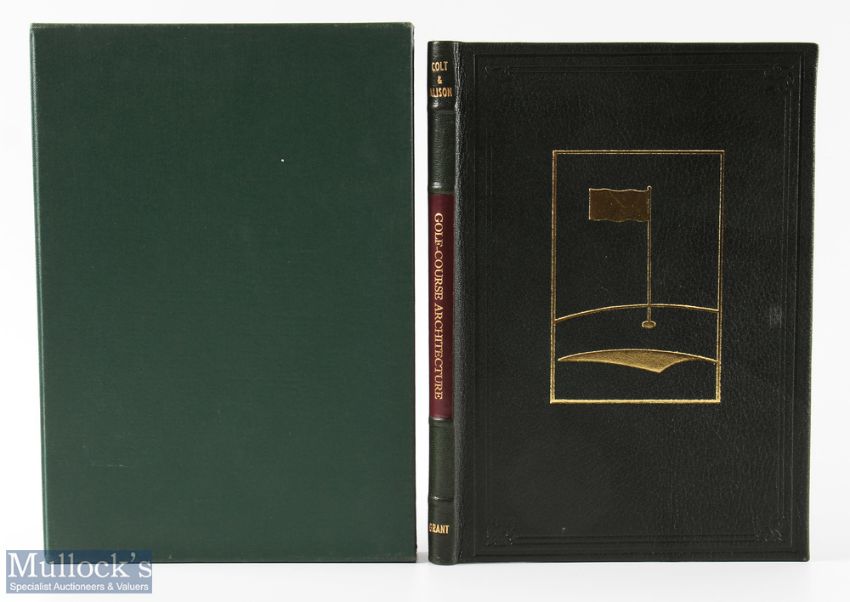Colt, H S & Alison, C H - signed 'Some Essays on Golf Course Architecture' reprint of the 1st ed 1920 - publisher's presentation deluxe leather ltd ed no.68/100 signed by F Hawtree and G Cornish, by Grant Books, with contributions by Dr A Mackenzie, Horace G Hutchinson, John L Lowe and others, 78p, bound in green leather with gilt and cloth slipcase, superb condition V/G