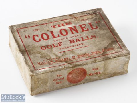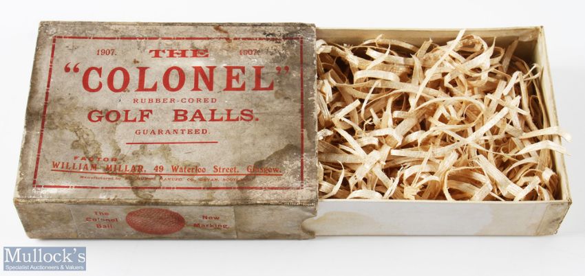 Scarce 1907 St Mungo Manufg, Govan Scotland "The Colonel" Rubber Cored Golf Ball Box - for 12 c/w sliding tray and all the original makers labels - soiled but all still intact - overall 5.5" x 7.25" x 2". From the late David Easby Estate