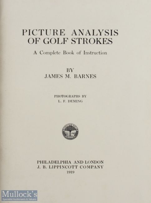 Early 20th c US Golf Instruction Book - Barnes, James M - "Picture Analysis of Golf Strokes - a Complete Book of Instruction" 1st 1919, publ'd J B Lippincott Co Philadelphia (dated 1919 and signed from W B L) in original blue and gilt cloth boards with photograph laid down to cover, with photograph images throughout with reference to the driver, brassie, spoon, cleek, mashie, mid irons, niblicks, considered by today's golf professionals as one of the best instruction books then and even now - some slight shelf otherwise overall (F/G). Note this was the first golf instruction book to rely heavily on sequence photography - as well as using reversed photographs to aid left handers