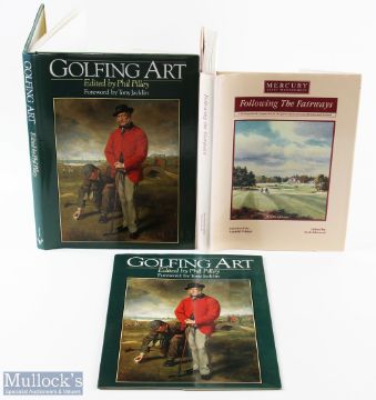 Collection of Golf Books on Artwork Signed by the Editors and Nick Faldo Open Golf Champion (3) Phil Pilley editor - "Golfing Art" 1st ed 1989 c/w dust jacket signed by the author to main title page and marketing proof again signed by the author dedicated to 'David' in matching wrapper c/w 3x coloured illustrations both unread (VG); and Nick Edmund (Editor) "Following The Fairways - A Distinguished Companion to the golf courses of Great Britain and Ireland" 1st ed 1997 c/w dust jacket and signed by Edmund and Nick Faldo Open Golf Champion well produced book with coloured illustrations and golf club details - appears unread (VG) From the late David Easby Estate