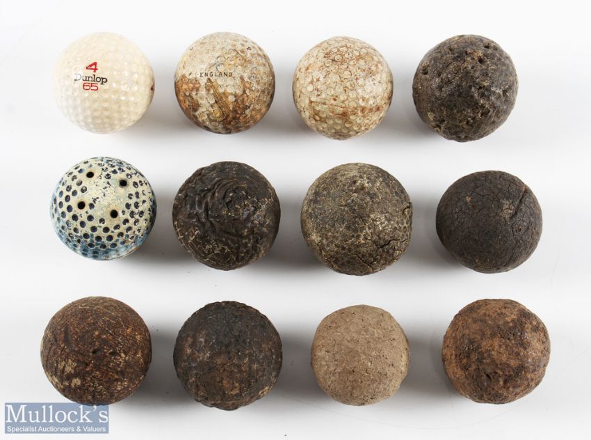 8x various pattern guttie golf balls plus 4x latter dimple golf balls (12)- all well used, various sizes both square pattern and bramble pattern golf balls - some devoid of markings, hence overall (AF) From the late David Easby Estate