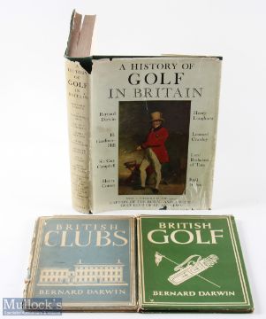Darwin, Bernard Collection of Golf Books (3) to incl "A History of Golf In Britain" 1st ed 1952 original green cloth boards and scarce dust jacket - some tears, creases and wear to d/j - small amount of Sellotape to prevent more rips otherwise (G); "British Golf" 1st ed 19 c/w dust jacket (minor tears) - 35 illustrations with 8 various plates in colour (F/G); and "British Clubs" 1st ed 1944 c/w dust jacket (some tears, crease and wear to spine) c/w 28 illustrations with 8x colour plates - clean internally overall (F/G)