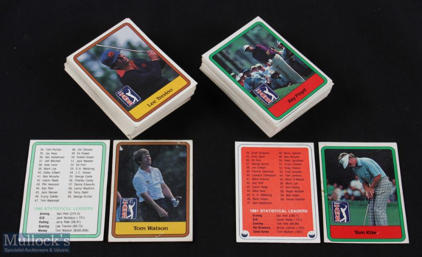 2x Early 1980s sets of US PGA Money Winners Golf Cards - 1980 Top 60 Money Winners Cards from No.1 Tom Watson winning $530,808 down to George Archer plus 5x Statistical Leader Cards for Driving Dan Pohl (274.3yds); GIR Jack Nicklaus (0.721); Putting Jerry Pate (28.81); Scoring Lee Trevino (69.73) and Money Tom Watson; plus 1981 Top 60 Money Winners No.1 Tom Kite winning $375,699 down to Vance Heafner c/w 5x Statistical Leader Cards Driving Dan Pohl (280.1); GIR Calvin Peate (.731); Scoring Tom Kite (69.80); Par Breakers Bruce Lietzke (.225) and Sand Saves Tom Watson ( 0.601) - both sets with the exception of the top card are overall (G) From the late David Easby Estate